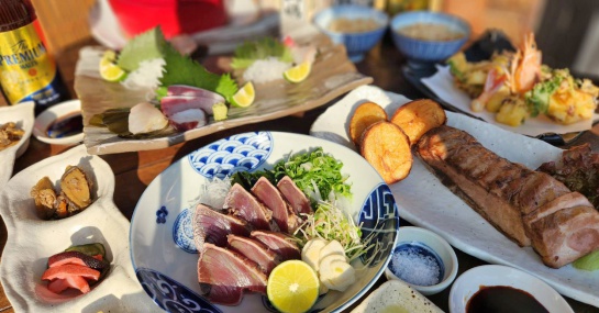| 料理 | 前菜三種 お造り3種盛り オリーブ豚のステーキ 鰹のたたき 季節のてんぷら 鯛めし 汁 フルーツ |