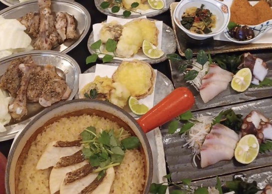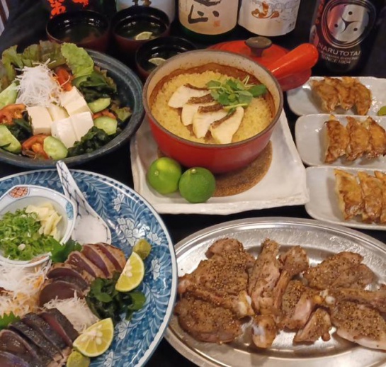 | 料理 | ・鳴門わかめと豆腐のサラダ ・皿鉢風大皿料理6品 ※季節により内容が変わる場合がございます。 ・名物、徳島餃子 ・カツオの塩たたき ・名物、骨付き鶏ひな、キャベツ ・胡麻塩おむすび ・鳴門わかめとあさりのお吸い物 ・デザート(和三盆水羊羹) ※当日の仕入れの都合によって、食材が変更になる場合もございます。 |